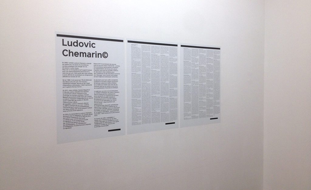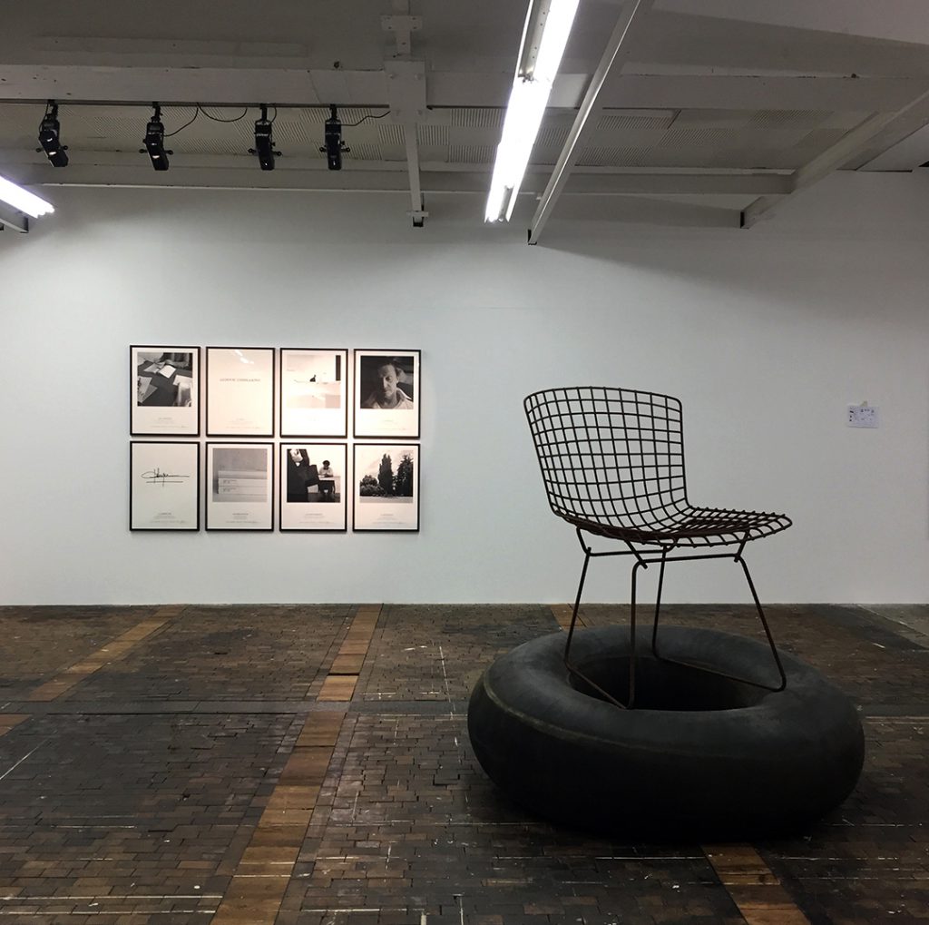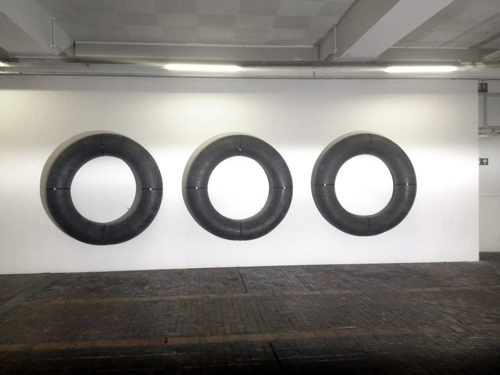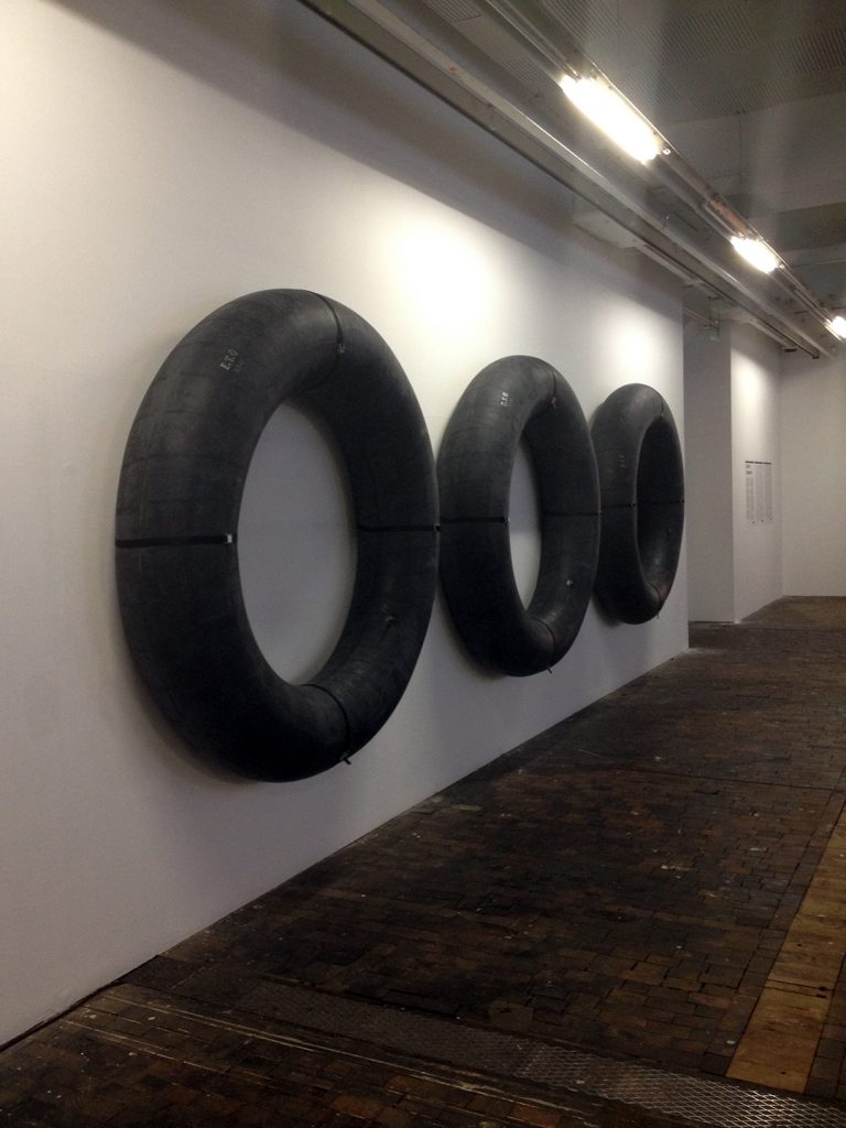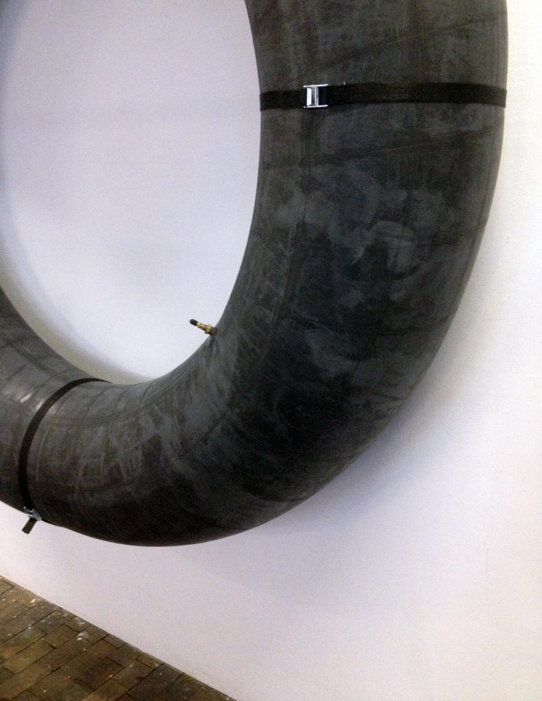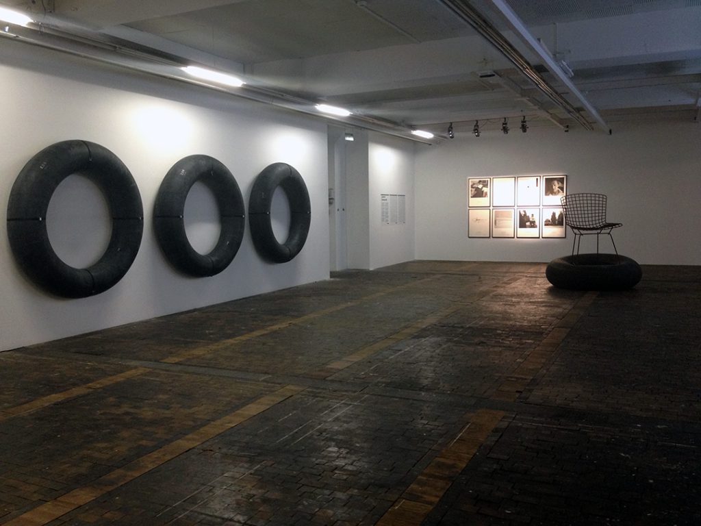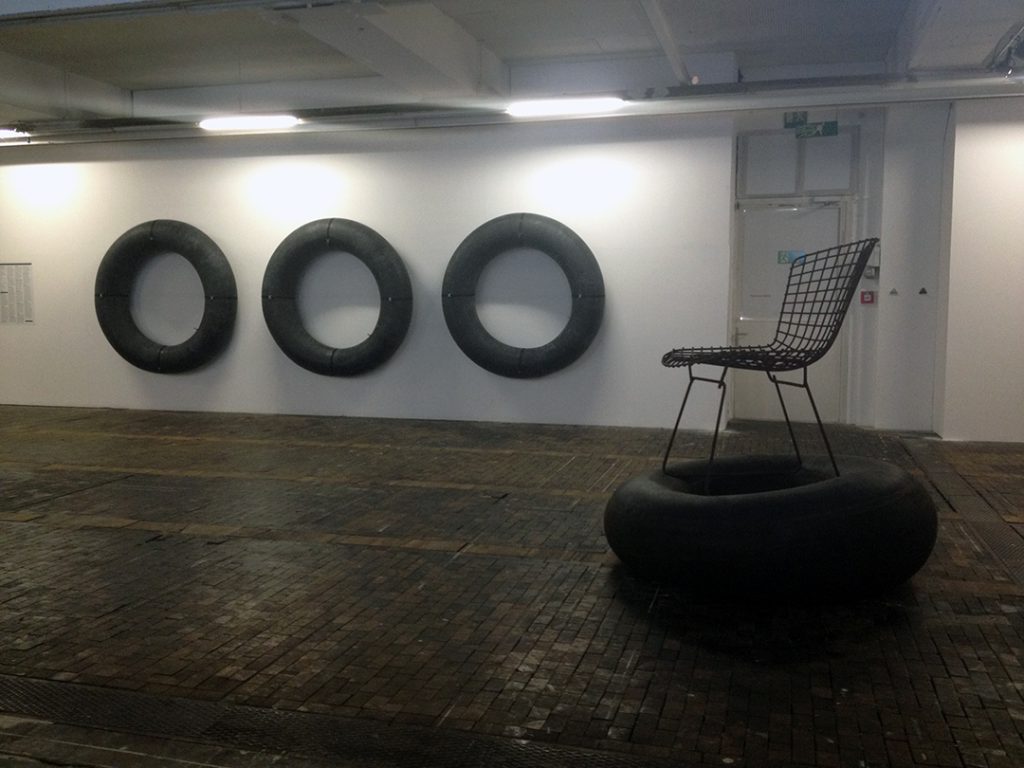 Ludovic Chemarin© présente la Chaise-bouée Bertoia ainsi que les huit sérigraphies des étapes fondatrices du projet. Trois affiches collées au mur égrènent l’histoire de l’artiste depuis 2011. Une nouvelle œuvre est produite pour l’occasion : Spectaculaire, elle se compose de trois grandes chambres à air de tracteur fixées au mur par des sangles – trois donuts géants.